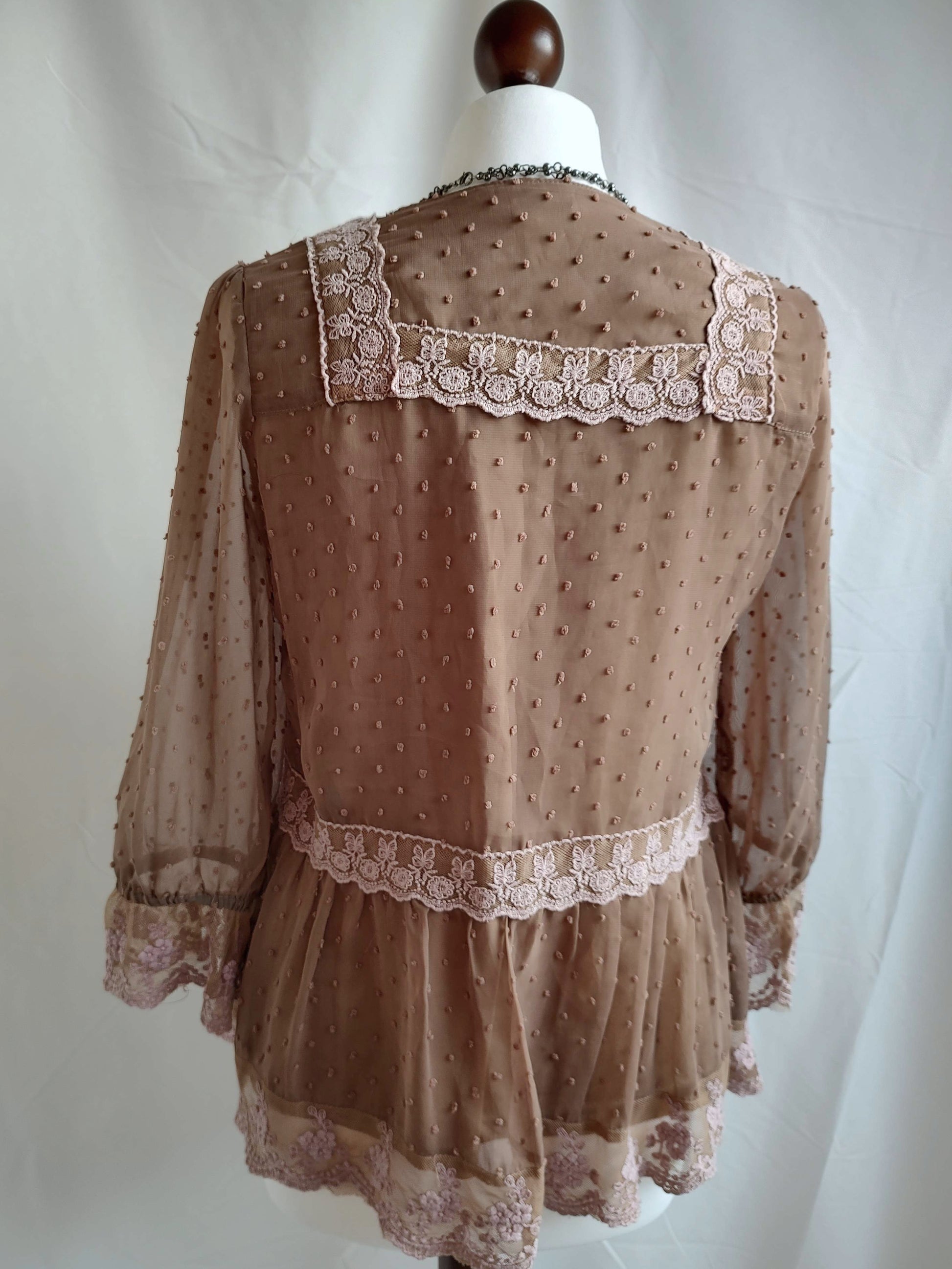 Vintage long-sleeve sheer layered brown blouse with lace detailing.
